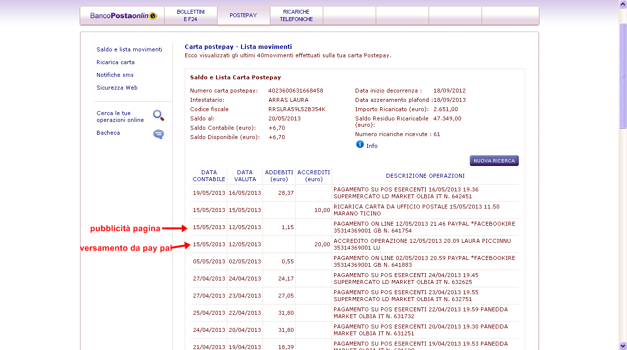 | 19/10/2012 | 19/10/2012 | 10,00 | RICARICA POSTEPAY DA POSTEMOBILE 19/10/2012 09:57:50 | |